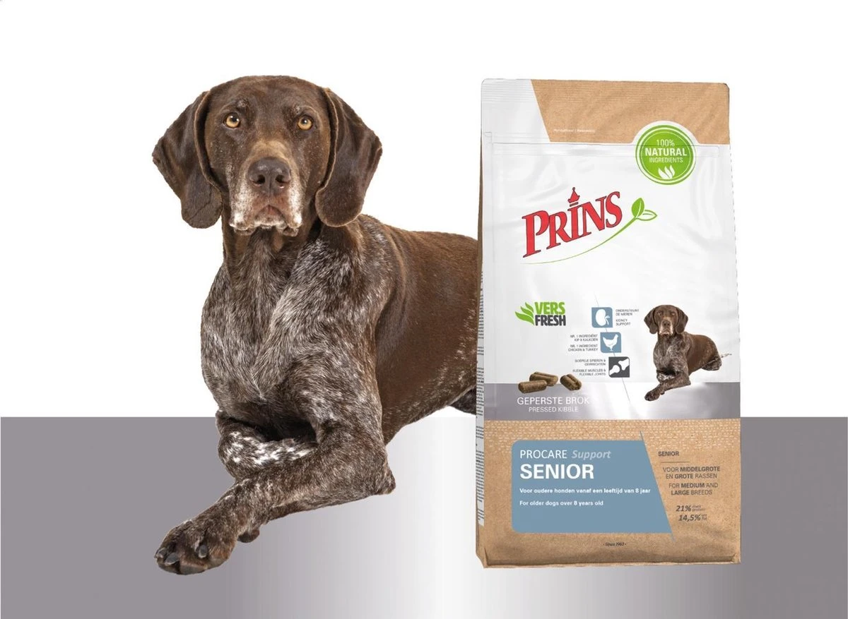 ProCare senior is een hoogwaardige voeding die ondersteuning biedt aan je hond op leeftijd. Een verlaagd eiwitgehalte en aangepaste hoeveelheid mineralen ontlasten de nieren. Door de toevoeging van glucosamine en chondroïtine wordt het kraakbeen extra ondersteund en de gewrichten soepel gehouden. De natuurlijke vezels die in de voeding zitten dragen bij aan een optimale stofwisseling en handhaving van het juiste gewicht waardoor je oudere hond zich prima kan blijven bewegen.