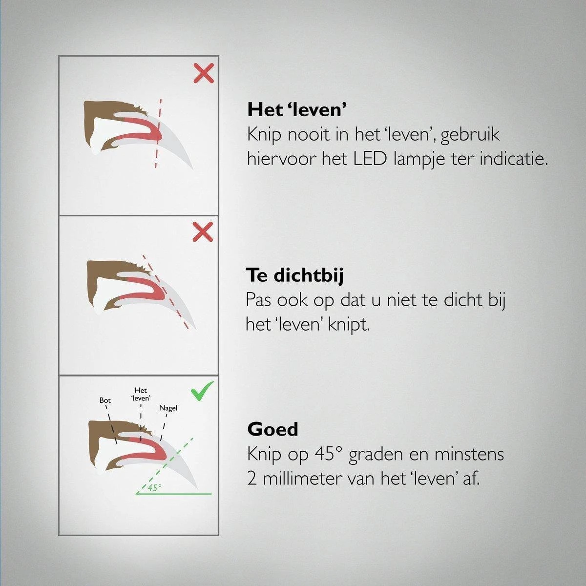 Niemand vindt het prettig om na het knippen van de nagels van uw huisdier de verloren nagels van de grond te moeten opruimen. De LED-nagelknipper heeft daar de ideale oplossing voor. Door middel van het anti-spring ontwerp worden de nagels opgevangen in de nagelknipper. Wanneer u klaar bent met het knippen van de nagels kunt u de nagelknipper gemakkelijk legen.