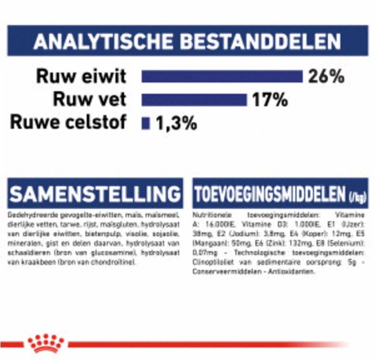 | Voedingswaarde | Samensteling: maïs, gedehydreerde gevogelte-eiwitten, maïsmeel, dierlijke vetten, gedehydreerd varkenseiwit, hydrolysaat van dierlijke eiwitten, bietenpulp, maïsgluten, mineralen, visolie, sojaolie, gist, hydrolysaat van schaaldieren (bron van glucosamine), hydrolysaat van kraakbeen (bron van chondroïtine) |