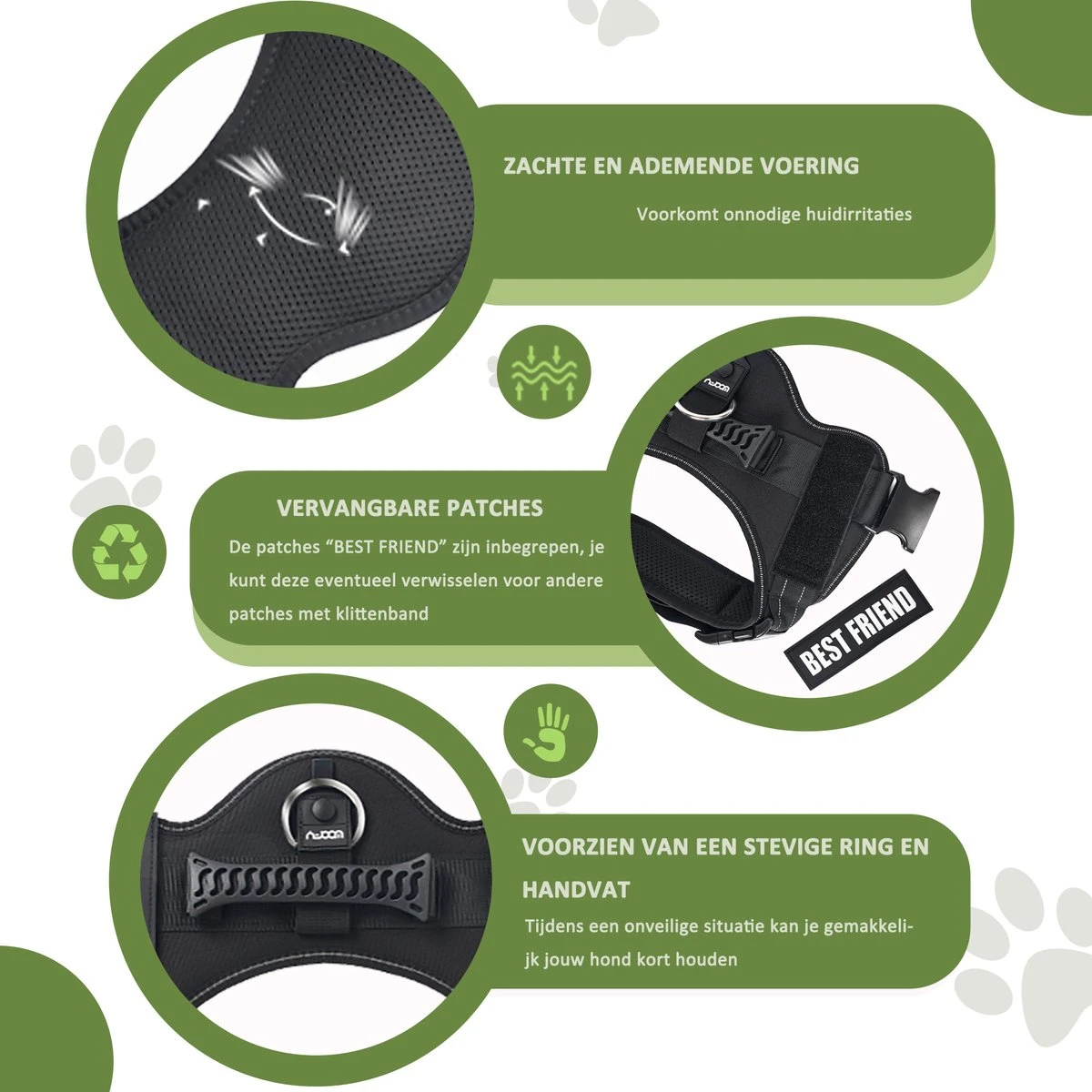 Het hondentuig is voorzien van reflecterende randen. Dit zorgt voor veiligheid tijdens het uitlaten wanneer het donker is. Wanneer er bijvoorbeeld autolampen op je hond schijnen, geeft het hondentuig een duidelijke reflectie weer.