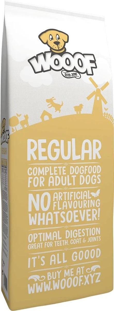 WOOOF regular 14KG is geschikt voor zowel grote als kleine honden met een gemiddeld energieverbruik. Het begint allemaal met natuurlijke ingrediënten. Natuurlijk. Je wilt precies weten wat je hond eet. Echte en herkenbare ingrediënten die je kent en vertrouwt. Ook kijk je naar vitaminen en mineralen.